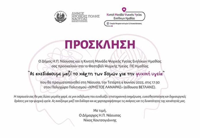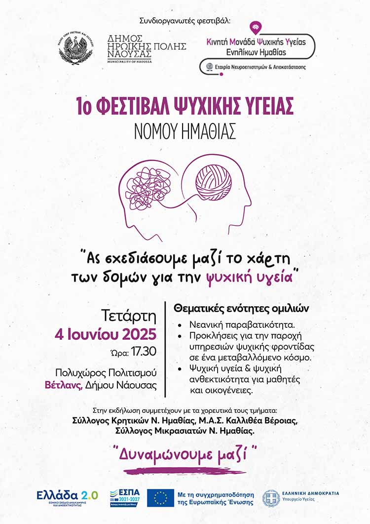 Ο Δήμος Ηρωικής Πόλεως Νάουσας και η Κινητή Μονάδα Ψυχικής Υγείας Ενηλίκων Ημαθίας (Εταιρία Νευροεπιστημών και Αποκατάσταση) συνδιοργανώνουν το 1ο Φεστιβάλ Ψυχικής Υγείας Νομού Ημαθίας, την Τετάρτη 4 Ιουνίου 2025, στις 17:30, στην αίθουσα ΒΕΤΛΑΝΣ του Πολυχώρου Πολιτισμού «Χρήστος Λαναράς».