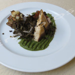 Cooking recipes: Amberjack with celery puree, sautéed vegetables, roasted garlic and nori seaweed.