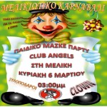Ο Λαογραφικός Όμιλος Μελίκης και Περιχώρων στα πλαίσια του Μελικιώτικου καρναβαλιού διοργανώνει παιδικό μασκέ πάρτυ με ξυλοπόδαρους και clown στο club ANGELS στην Μελίκη...