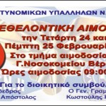 Σας γνωρίζουμε ότι την Τετάρτη 24 και Πέμπτη 25 Φεβρουαρίου 2016 και από ώρες 09.00 έως 13.00, στο Γ.Ν.Ν Βέροιας, θα πραγματοποιηθεί ομαδική εθελοντική...
