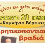 Ο Σύλλογος Κρητικών Ημαθίας και η Εύξεινος Λέσχη Βέροιας, σας προσκαλούν την Παρασκευή 23 Ιουνίου 2017 στο Κομνήνιο Βέροιας για μια μεγάλη Κρητικοποντιακή βραδιά.
