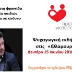 Η Πρωτοβουλία για το Παιδί διοργανώνει και εφέτος την τακτική ψυχαγωγική της εκδήλωση στο Κέντρο «Φλαμουριές», τη Δευτέρα 25 Ιουνίου 2018, με ώρα έναρξης...