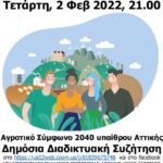 Την Τετάρτη, 2 Φεβ 2022, στις 21.00 ο Κτηνοτροφικός Σύλλογος Περιφέρειας Αττικής-Άγιος Γεώργιος προσκαλεί σε δημόσια διαδικτυακή συζήτηση για ένα «Αγροτικό Σύμφωνο 2040» στο...