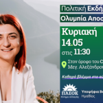 Πολιτική Εκδήλωση στη Νάουσα θα πραγματοποιήσει η υποψήφια Βουλευτής Ημαθίας με το ΠΑ.ΣΟ.Κ. -Κίνημα Αλλαγής Ολυμπία Αποστόλου, την Κυριακή 14 Μαϊου στις 11.30πμ στον...