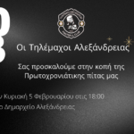 Οι Τηλέμαχοι Αλεξάνδρειας σας προσκαλούμε στην κοπή βασιλόπιτας της ομάδας μας, την Κυριακή 5 Φεβρουαρίου και ώρα 18:στο Δημαρχείο Αλεξάνδρειας.