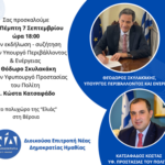 Σας προσκαλούμε την Πέμπτη 7 Σεπτεμβρίου ώρα 18:00 στην εκδήλωση - συζήτηση με τον Υπουργό Περιβάλλοντος & Ενέργειας κ.Θόδωρο Σκυλακάκη και τον Υφυπουργό Προστασίας...