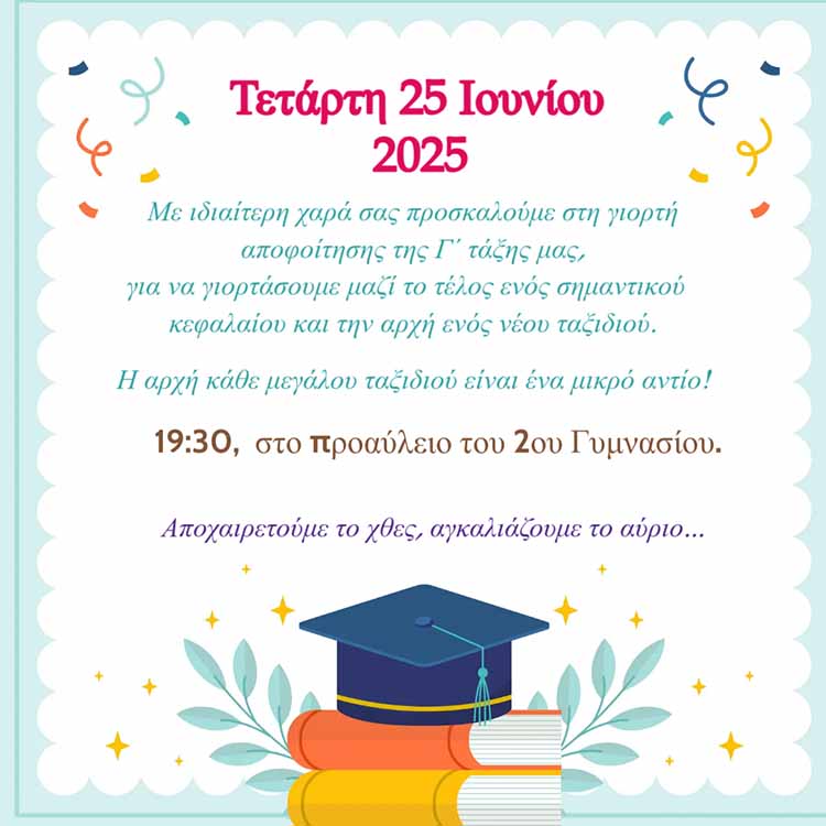 Αλεξάνδρεια 2ο Γυμνάσιο Αλεξάνδρειας: Πρόσκληση για την τελετή αποφοίτησης των μαθητών /τριών της Γ’ Γυμνασίου Από Έμβολος - 23/06/2025 Πρόσκληση για την τελετή αποφοίτησης των μαθητών /τριών της Γ’ Γυμνασίου