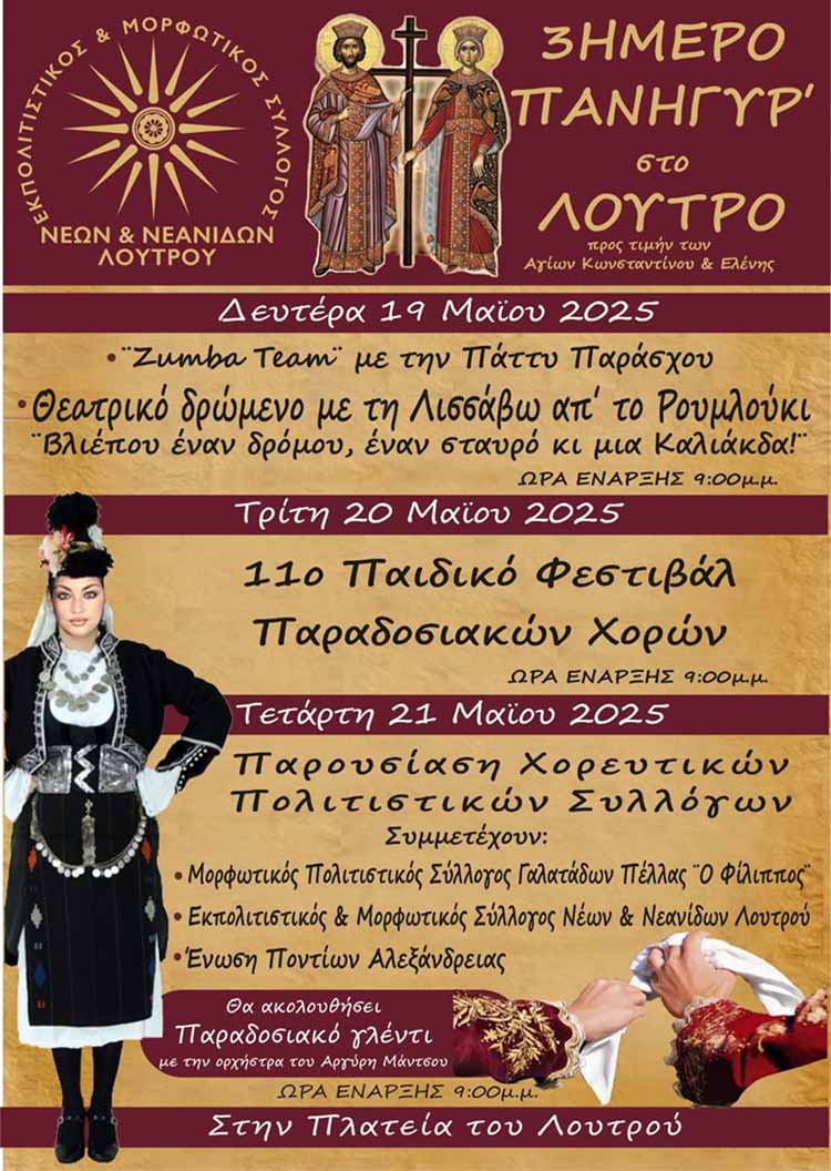 Ο Εκπολιτιστικός & Μορφωτικός Σύλλογος Νέων & Νεανίδων Λουτρού σας προσκαλεί στο παραδοσιακό 3ήμερο πανηγύρι που θα πραγματοποιηθεί στην Πλατεία Λουτρού, από Δευτέρα 19 έως Τετάρτη 21 Μαΐου 2025, τιμώντας τη μνήμη των Αγίων Κωνσταντίνου και Ελένης.