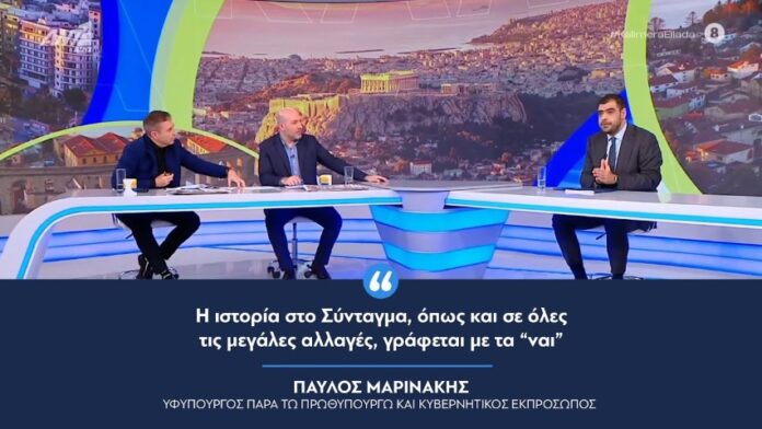 Π. ΜΑΡΙΝΑΚΗΣ: Λοιπόν, η ιστορία γράφεται με τα «ναι» στην αναθεώρηση του συντάγματος και υπάρχουν και τα «όχι», που τα καταγράφει η ιστορία ως τους μεγάλους απόντες από τις μεγάλες αλλαγές. Παράδειγμα: αναθεώρηση άρθρου 16, 2005-2008. Τότε που υπαναχώρησε το ΠΑΣΟΚ και έχασε η χώρα μας 20 χρόνια, σε αντίθεση με το τί συνέβη στην Κύπρο, έχασε φοιτητές, ανθρώπινο κεφάλαιο, έχασε χρήματα και ευκαιρίες. Η ιστορία, λοιπόν, στο Σύνταγμα, όπως και στις μεγάλες αλλαγές, γράφεται με τα μεγάλα «ναι» και τις μεγάλες συναινέσεις. Θα έρθουμε, λοιπόν, και θα πούμε: «Κύριοι, εμείς θεωρούμε ότι πρέπει αυτά τα άρθρα να αναθεωρηθούν. Όλα τα κόμματα, όλοι οι βουλευτές…»…