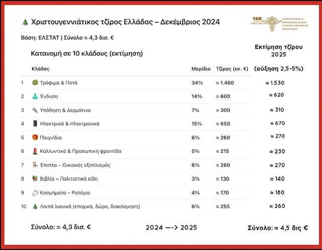 Μια εκτίμηση του «χριστουγεννιάτικου τζίρου» για το 2025 ανά κλάδο στην Ελλάδα δείχνει πως θα κυμανθεί κοντά στα 4,5 δις ευρώ. Μια «προσεγγιστική» ανάλυση σε 10 κλάδους δείχνει πως και φέτος με μερίδιο 34% στα τρόφιμα και ποτά θα δαπανηθούν τα περισσοτέρα με περίπου 1,53 δις ευρώ. Στην ένδυση με μερίδιο 14% περίπου 620 εκατ. ευρώ και στην υπόδηση με 7% περίπου 310 εκατ. ευρώ Στα ηλεκτρικά και ηλεκτρονικά είδη με μερίδιο 15% περίπου 670 εκατ. ευρώ. Στα παιχνίδια με μερίδιο 6% περίπου 270 εκατ. ευρώ. Στα καλλυντικά με μερίδιο 5% περίπου 230 εκατ. ευρώ. Στον οικιακό εξοπλισμό με μερίδιο 6% περίπου 270 εκατ. ευρώ. Στα βιβλία και πολιτιστικά είδη με μερίδιο 3% περίπου 140 εκατ. ευρώ. Σε κοσμήματα και ρολόγια με μερίδιο 4% περίπου 180 εκατ. ευρώ. Τέλος για τα υπόλοιπα, εποχικά δώρα και είδη διακόσμησης με μερίδιο 6% περίπου 260 εκατ. ευρώ.