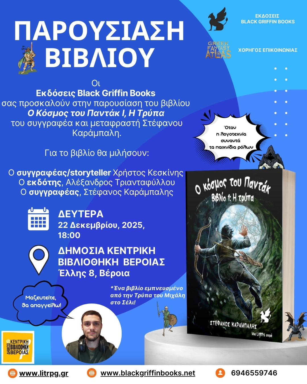 Ο εκδοτικός οίκος Black Griffin Books ανακοινώνει με χαρά την κυκλοφορία του νέου βιβλίου “Ο Κόσμος του Παντάκ” του Στέφανου Καράμπαλη. Το βιβλίο θα παρουσιαστεί σε ειδική εκδήλωση στις 22/12/2025 και ώρα 18.00 στη Δημόσια Κεντρική Βιβλιοθήκη Βέροιας. Η είσοδος είναι ελεύθερη.