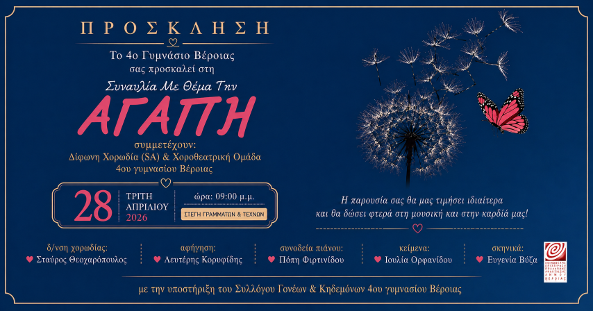 Η δίφωνη παιδική χορωδία του 4ου Γυμνάσιου Βέροιας την Τρίτη 28 Απριλίου 2026 στις 21:00 στη Στέγη Γραμμάτων και Τεχνών του Δήμου Βέροιας, παρουσιάζει μια ξεχωριστή μουσικοθεατρική παράσταση αφιερωμένη στο πιο διαχρονικό και πολυδιάστατο συναίσθημα: την αγάπη.
