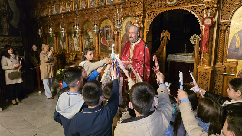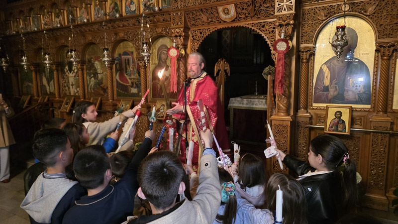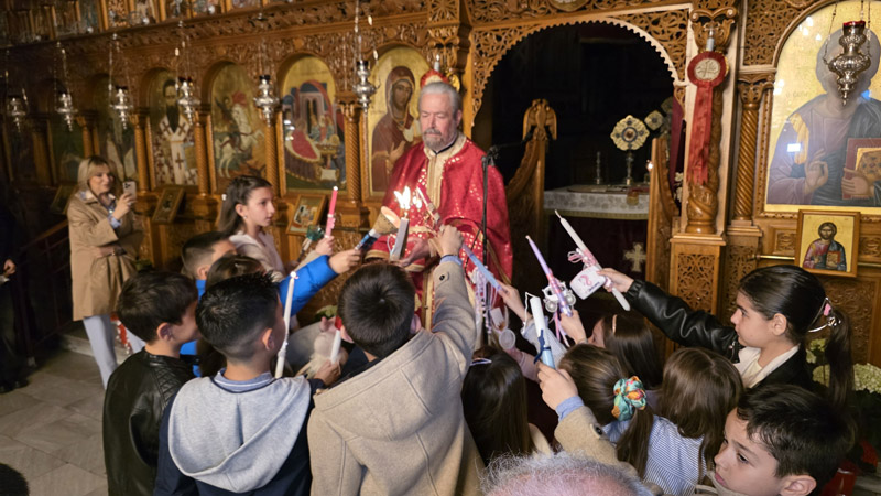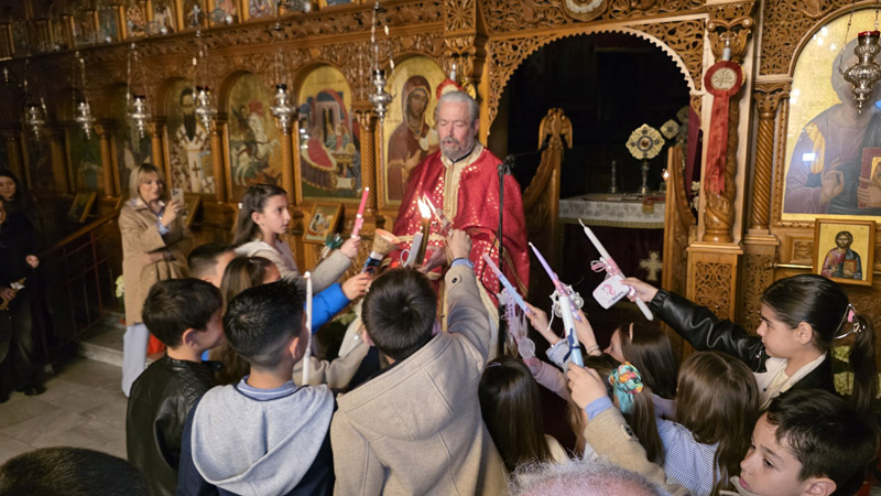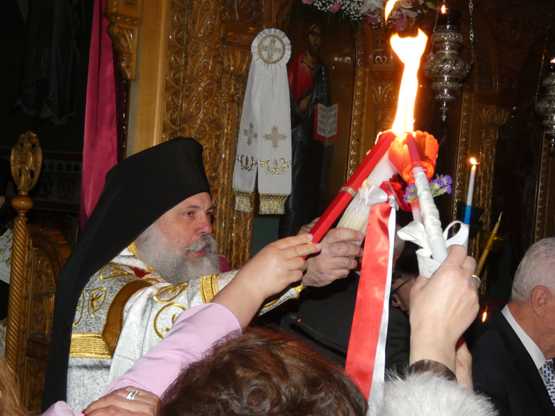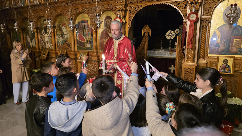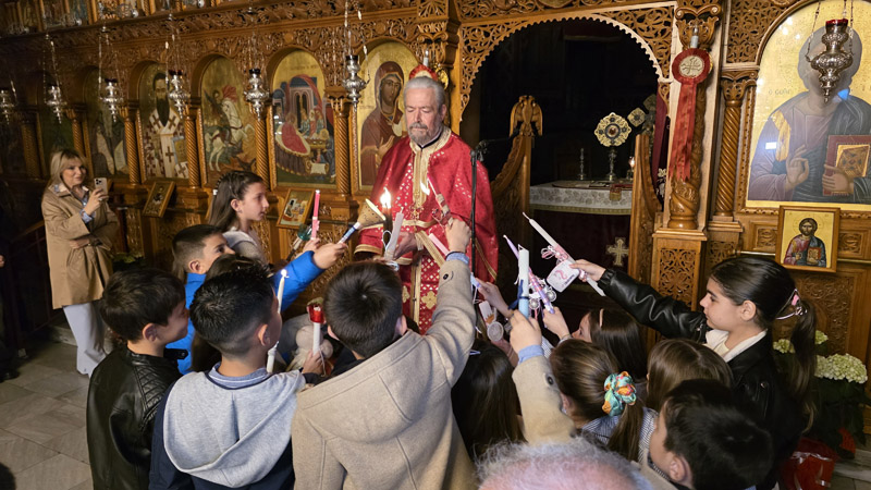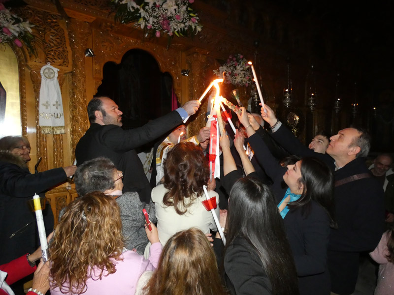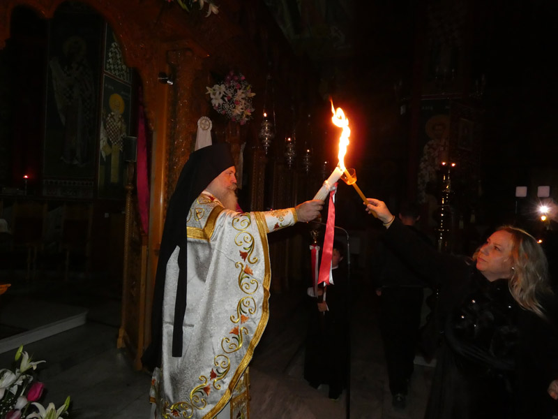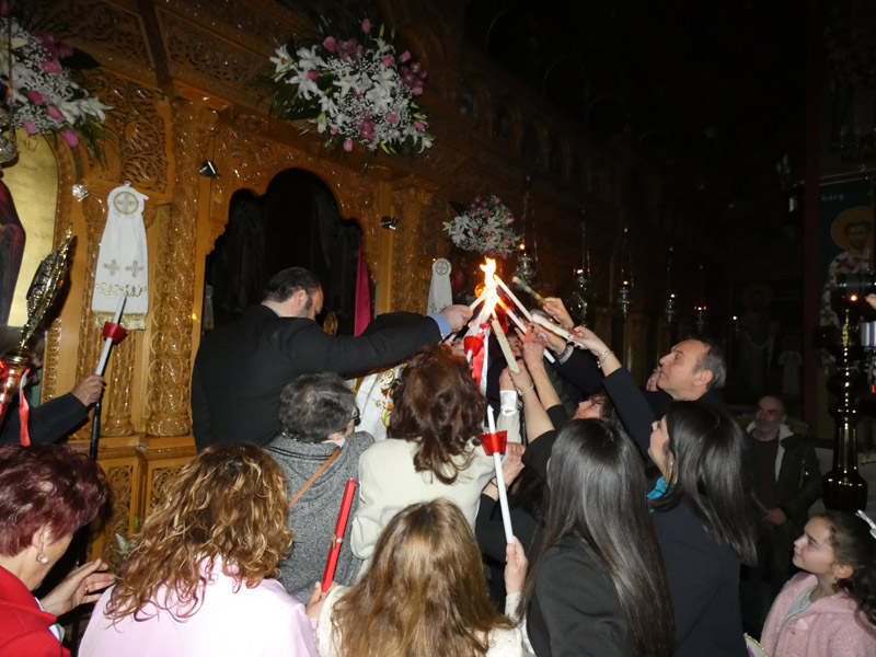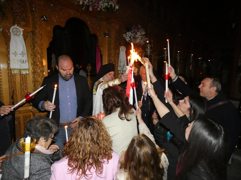 Το Άγιο Φως έκανε την άφιξή του και τηρήθηκε με επιμέλεια και ευλάβεια εντός του ναού, έως τη στιγμή του “Δεύτε, λάβετε φώς”. Το εσωτερικό της εκκλησίας φωτίστηκε με τη μεταλαμπάδευση του Αγίου Φωτός, με χαμόγελα και τις πρώτες ευχές μεταξύ των πιστών.