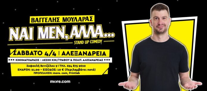 Ο stand up comedian Βαγγέλης Μουλαράς παρουσιάζει τη νέα του παράσταση «Ναι μεν, αλλά…» το Σάββατο 4 Απριλίου στη Λέσχη ΚΙΝΗΜΑΤΟΔΡΑΣΙΣ .