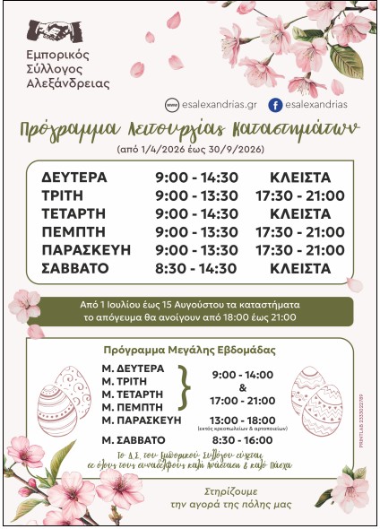 Εμπορικός Σύλλογος Αλεξάνδρειας: Θερινό πρόγραμμα λειτουργίας καταστημάτων και εορτών Πάσχα