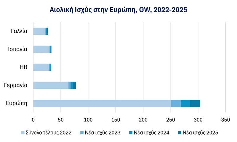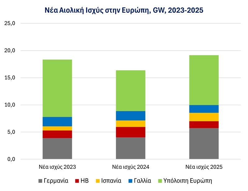 Συνολικά, η ευρωπαϊκή αιολική ισχύς ανήλθε στα 304 GW το τέλος του 2025. Ο άνεμος κάλυψε το 19% της ηλεκτρικής ζήτησης στην Ε.Ε., επιβεβαιώνοντας ότι η αιολική ενέργεια κατέχει σημαντικό μερίδιο στο ενεργειακό μείγμα της ηπείρου γεγονός που συμβάλλει στη συγκράτηση των τιμών του ηλεκτρισμού.