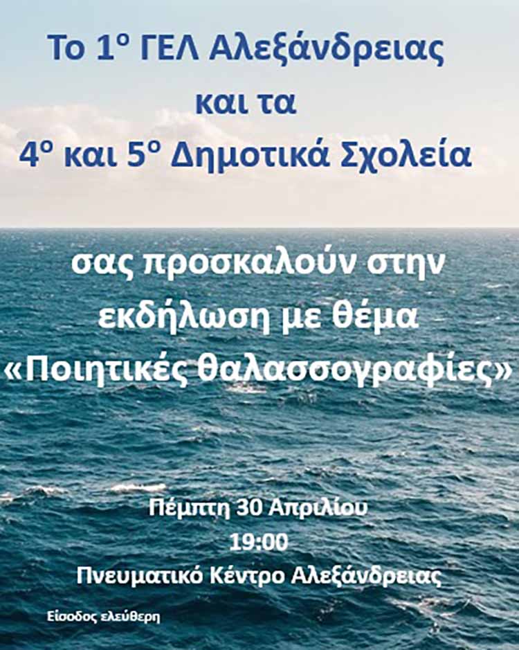 Σας προσκαλούμε να μοιραστείτε μαζί μας αυτή τη μοναδική εμπειρία, καθώς  η ποίηση συναντά τη μουσική και η θάλασσα γίνεται κοινός τόπος  δημιουργίας, την Πέμπτη 30 Απριλίου και ώρα 19:00 στο Πνευματικό Κέντρο Αλεξάνδρειας.