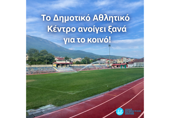 Η Αντιδημαρχία Αθλητισμού ενημερώνει ότι το Δημοτικό Γήπεδο τίθεται σε σταδιακή επαναλειτουργία ΑΠΟΚΛΕΙΣΤΙΚΑ για περπάτημα και ελαφρύ τρέξιμο στον στίβο (ταρτάν).