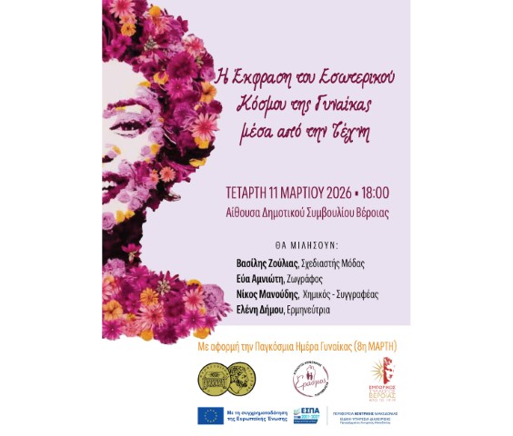 Ο Δήμος Βέροιας, ο Σύλλογος Κοινωνικής Παρέμβασης «Έρασμος» και ο Εμπορικός Σύλλογος Βέροιας συνδιοργανώνουν εκδήλωση με θέμα: «Η Έκφραση του Εσωτερικού Κόσμου της Γυναίκας μέσα από την Τέχνη» (Γράμματα, Μόδα,  Μουσική), το απόγευμα της Τετάρτης 11 Μαρτίου 2026, στις 18.00, στην Αίθουσα του Δημοτικού Συμβουλίου.