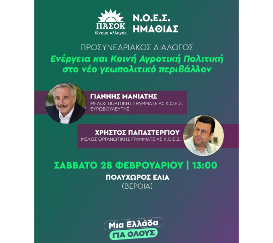 Εκδήλωση προσυνεδριακού διαλόγου διοργανώνει η Νομαρχιακή Οργανωτική Επιτροπή Συνεδρίου του ΠΑΣΟΚ – Κίνημα Αλλαγής Ημαθίας, με τη συμμετοχή του Ευρωβουλευτή  και μέλος της Πολιτικής Γραμματείας Κ.Ο.Ε.Σ. Γιάννη Μανιάτη και του μέλους της Οργανωτικής Γραμματείας Κ.Ο.Ε.Σ.  Χρήστου Παπαστεργίου.