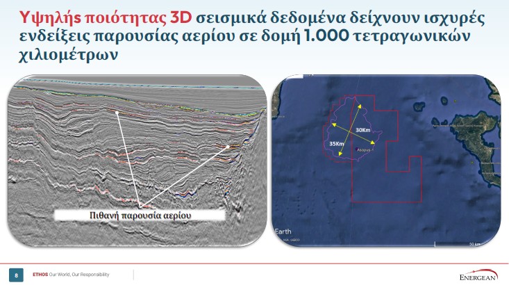 Η “ακτινογραφία” αυτή προέκυψε από τις τρισδιάστατες σεισμικές έρευνες που πραγματοποιήθηκαν το 2022 σε έκταση 1.000 τετραγωνικών χιλιομέτρων από τις οποίες προσδιορίστηκε, αφενός, ο στόχος του “Ασωπού” σε βάθος 4.622 μέτρων και αφετέρου η εκτίμηση για το δυναμικό της περιοχής που φθάνει στα 270 δισ. κυβικά μέτρα φυσικού αερίου. Μέγεθος τεράστιο για τα ελληνικά δεδομένα (καθώς η ετήσια κατανάλωση της χώρας μας κυμαίνεται στα 6-7 δισ.), ακόμη και αν ληφθεί υπόψη ότι αντλείται το 50 – 60 % της συνολικής ποσότητας.
