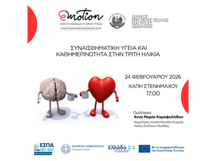 Η Κινητή Μονάδα Ψυχικής Υγείας Ν. Ημαθίας «Ε.Ν.Α.», σε συνεργασία με τον Δήμο Νάουσας και το ΚΑΠΗ Στενημάχου, σας προσκαλεί στην ομιλία με θέμα «Συναισθηματική Υγεία και Καθημερινότητα στην Τρίτη Ηλικία».
