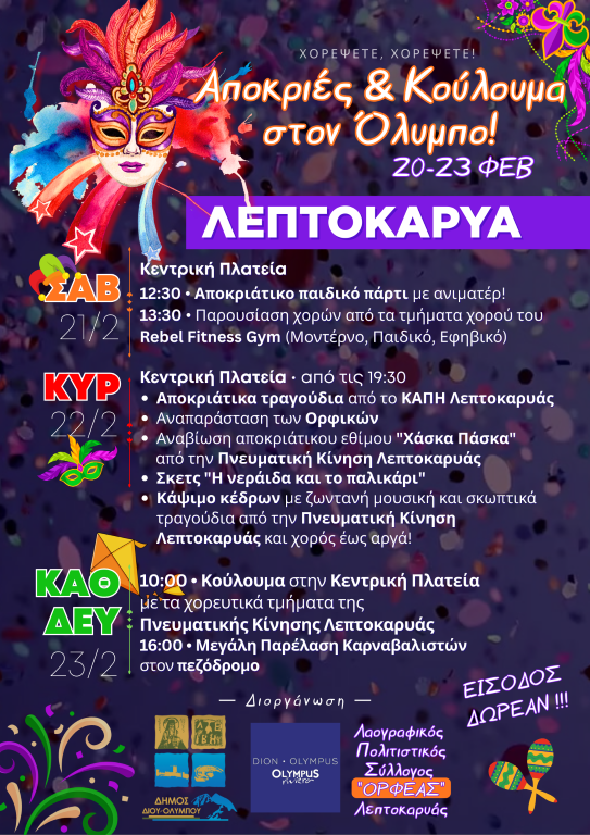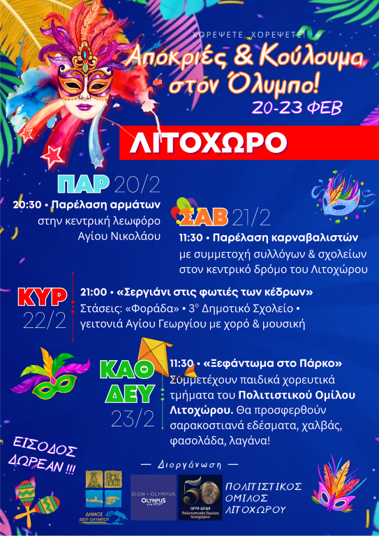 Ο Δήμος Δίου-Ολύμπου σας προσκαλεί στις εορταστικές εκδηλώσεις Αποκριάς και Καθαράς Δευτέρας (20-23 Φεβρουαρίου 2026), γεμάτες μουσική, χορούς και τραγούδια για μικρούς & μεγάλους και δωρεάν είσοδο.