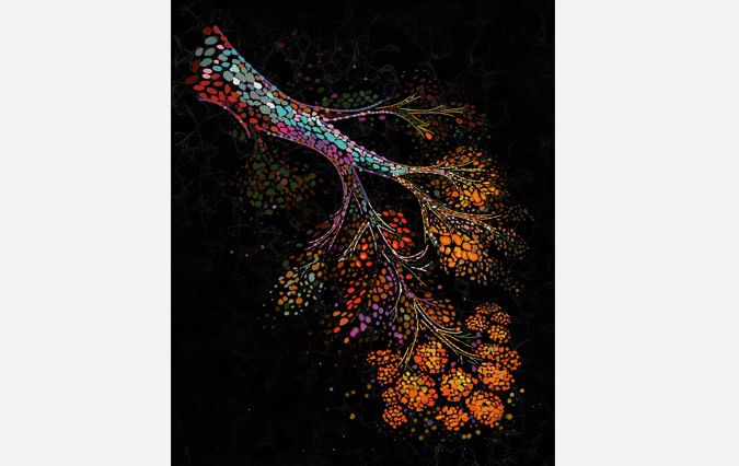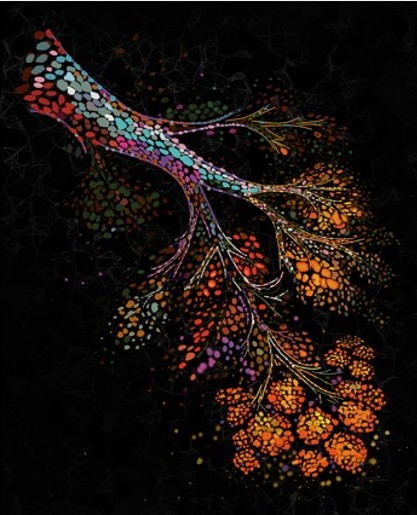 Σ.Σ. Επισυνάπτεται οπτική αναπαράσταση ενός γηρασμένου ανθρώπινου μαστού, που δείχνει ένα διακλαδιζόμενο δίκτυο πόρων, το οποίο αρχικά βρίσκεται μέσα σε ένα πυκνό μικροπεριβάλλον πλούσιο σε κύτταρα, αλλά με την πάροδο του χρόνου αντικαθίσταται σταδιακά από ιστό πλούσιο σε λίπος. Credit: Nature Aging/Raza Ali