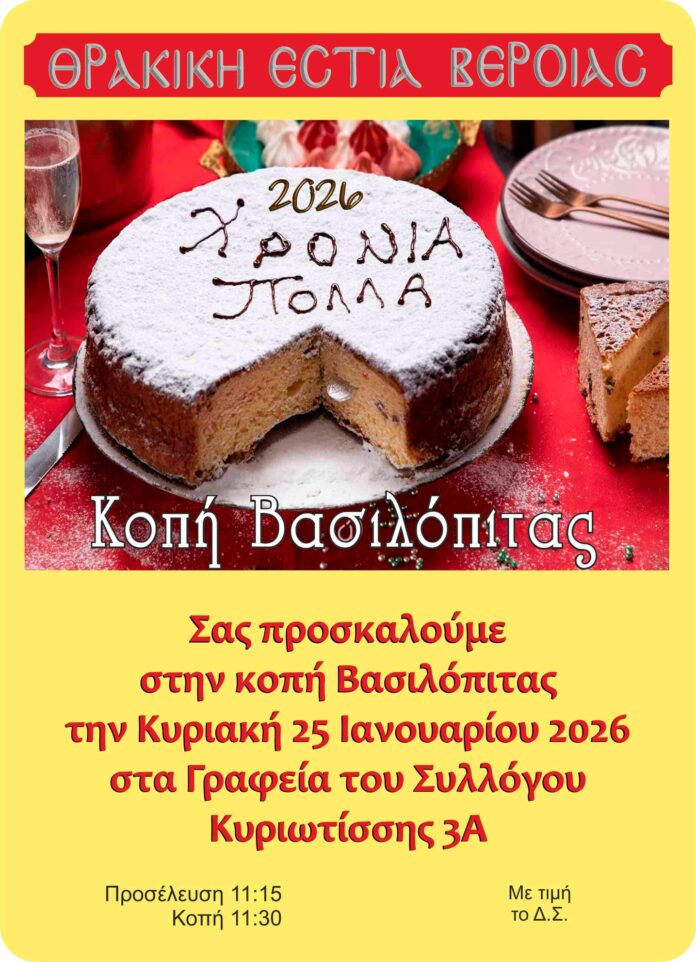 Σας προσκαλούμε στην κοπή Βασιλόπιτας την Κυριακή 25 Ιανουαρίου 2026 στα Γραφεία του Συλλόγου Κυριωτίσσης 3Α