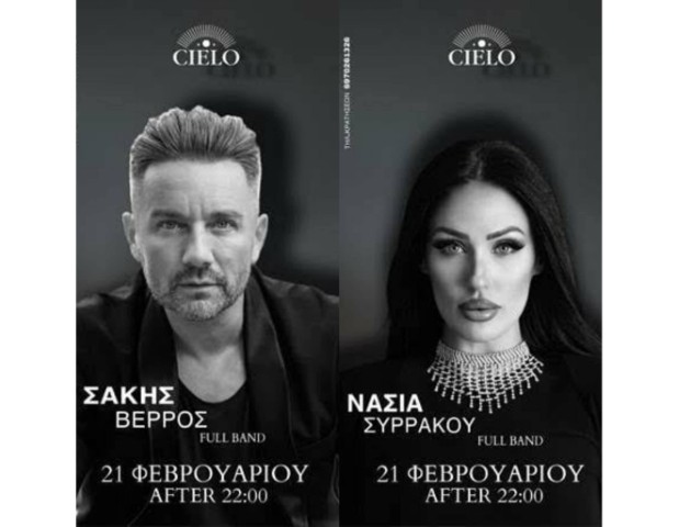 Ένας από τους αγαπημένους προορισμούς της Αλεξάνδρειας το CIELO που έχει γίνει talk-of-the-town, δίνει τώρα ακόμα ένα λόγο στους λάτρεις της ελληνικής μουσικής να διασκεδάσουν, φέρνοντας κοντά τους τον Σάκη  Βέρρο  και την εκρηκτική Νάσια Συρράκου την Σάββατο 21 Φεβρουαρίου σε μια βραδιά που σίγουρα θα μείνει αξέχαστη!