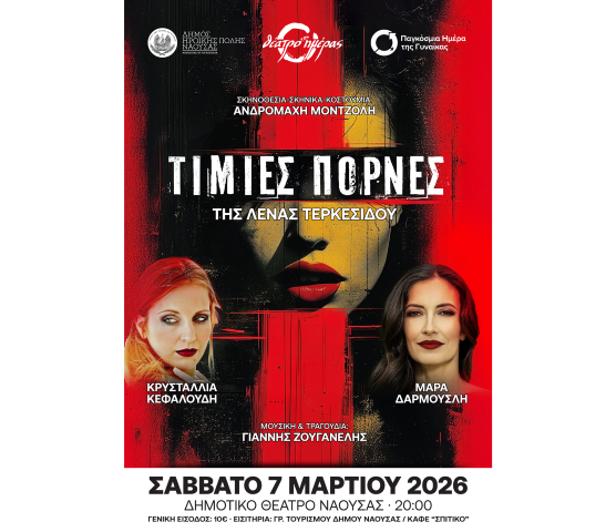 Ο Δήμος Ηρωικής Πόλης Νάουσας με αφορμή τον εορτασμό της Παγκόσμιας Ημέρας της Γυναίκας (8 Μαρτίου) παρουσιάζει την θεατρική παράσταση «Τίμιες Πόρνες» της Λένας Τερκεσίδου το Σάββατο 7 Μαρτίου 2026 και ώρα 20:00 στο Δημοτικό Θέατρο Νάουσας «Μίκης Θεοδωράκης».