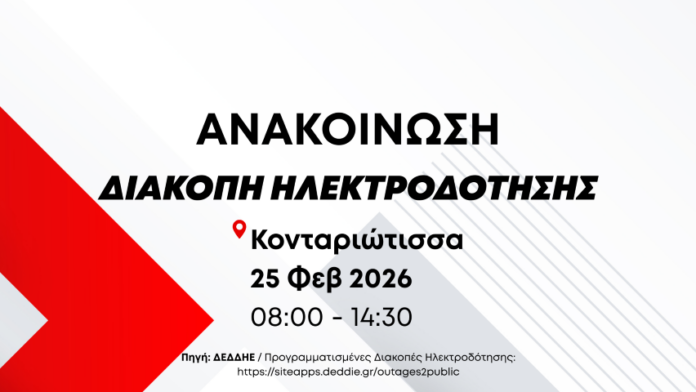 Σύμφωνα με ενημέρωση από τον ΔΕΔΔΗΕ την Τετάρτη 25 Φεβρουαρίου 2026 και ώρες 08:00 – 14:30 θα πραγματοποιηθεί προγραμματισμένη διακοπή ηλεκτροδότησης στην Κονταριώτισσα.