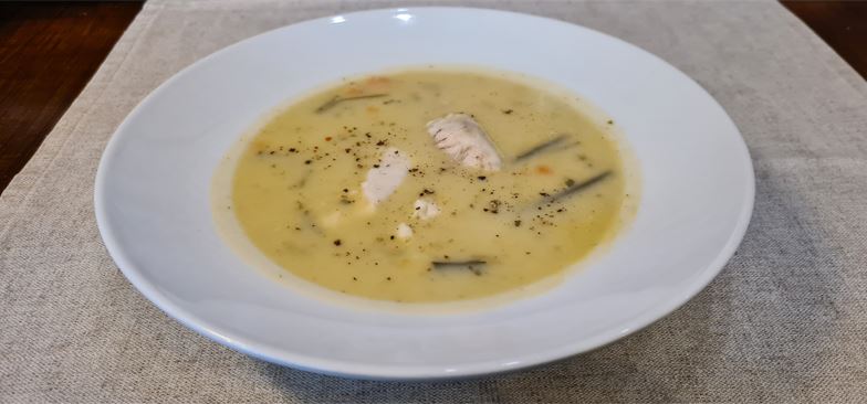 Σερβίρουμε τη σούπα σε βαθιά πιάτα και πασπαλίζουμε με φρεσκοτριμμένο πιπέρι και σχοινόπρασο.