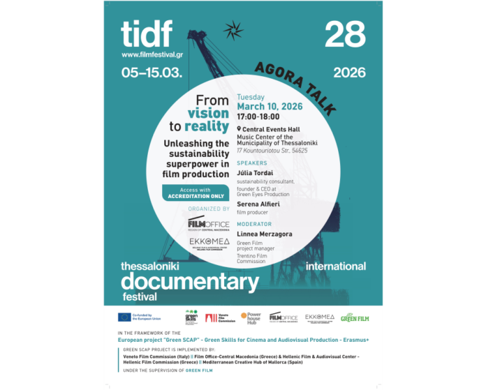 Με αφορμή το εργαστήριο, θα πραγματοποιηθεί ενημερωτική εκδήλωση στο πλαίσιο της ενότητας Agora Talks, με τίτλο: “From vision to reality: Unleashing the sustainability superpower in film production”. Η εκδήλωση θα διεξαχθεί την Τρίτη 10 Μαρτίου 2026 στο Κέντρο Μουσικής Δήμου Θεσσαλονίκης (Κουντουριώτου 17), στις 5 το απόγευμα, στο πλαίσιο της Αγοράς του 28ου Φεστιβάλ Ντοκιμαντέρ Θεσσαλονίκης. Θα πραγματοποιηθεί στα αγγλικά, θα ακολουθήσει συζήτηση και απευθύνεται αποκλειστικά σε διαπιστευμένους επαγγελματίες της Αγοράς.