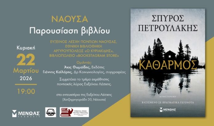 Η Εύξεινος Λέσχη Ποντίων Νάουσας – Εθνική Βιβλιοθήκη Αργυρουπόλεως «Ο Κυριακίδης» σε συνεργασία με το βιβλιοπωλείο Bookstagram και τις Εκδόσεις ΜΙΝΩΑΣ, διοργανώνουν την παρουσίαση του νέου βιβλίου «Καθαρμός» του συγγραφέα Σπύρου Πετρουλάκη.
