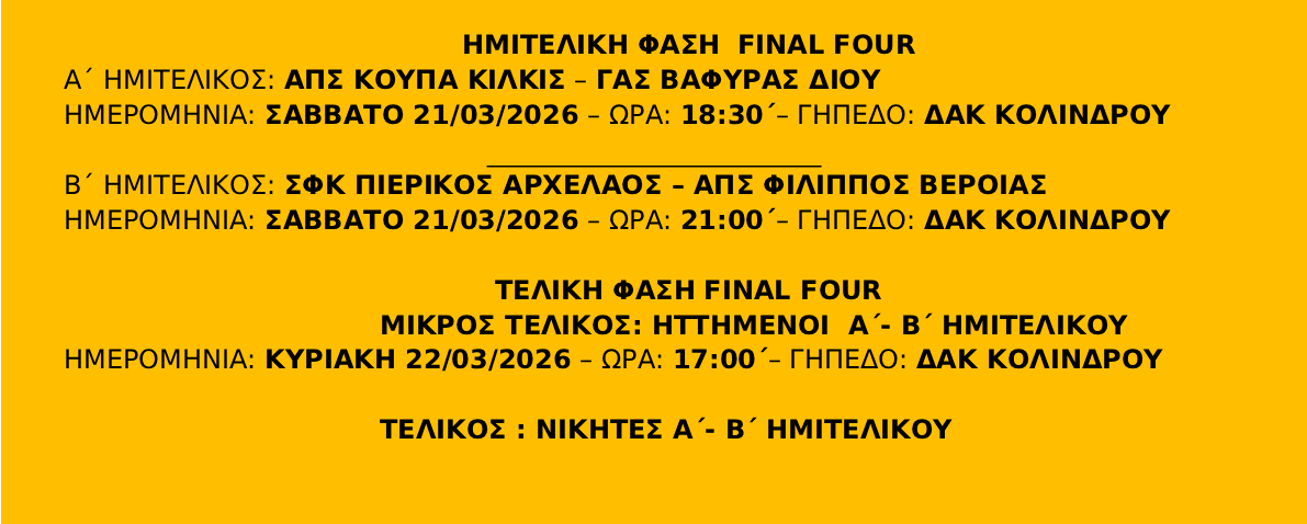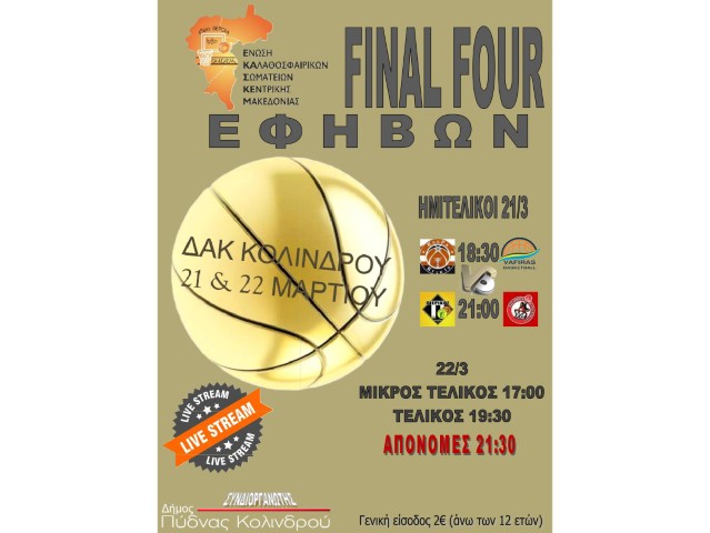 H Ένωση Καλαθοσφαιρικών Σωματείων Κεντρικής Μακεδονίας, σε συνεργασία με τον Δήμο Πύδνας Κολινδρού, διοργανώνει στις 21 & 22 Μαρτίου 2026, στο ΔΑΚ ΚΟΛΙΝΔΡΟΥ το FINAL FOUR του Πρωταθλήματος ΕΦΗΒΩΝ αγωνιστικής Περιόδου 2025-2026, στο οποίο θα πάρουν μέρος οι παρακάτω ομάδες: ΑΠΣ ΚΟΥΠΑ ΚΙΛΚΙΣ, ΣΦΚ ΠΙΕΡΙΚΟΣ ΑΡΧΕΛΑΟΣ, ΓΑΣ ΒΑΦΥΡΑΣ ΔΙΟΥ, ΑΠΣ ΦΙΛΙΠΠΟΣ ΒΕΡΟΙΑΣ
