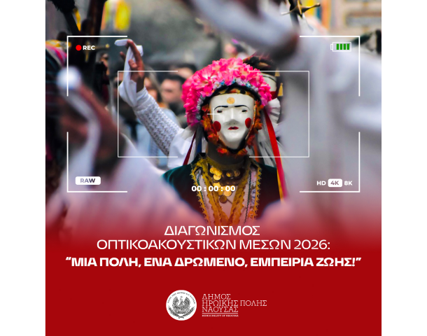 Ο Δήμος Ηρωικής Πόλεως Νάουσας και η Αντιδημαρχία Πολιτισμού, στο πλαίσιο των εκδηλώσεων «Νάουσα – Αποκριά 2026» και του κορυφαίου δρώμενου «Γενίτσαροι και Μπούλες», υλοποιούν με ιδιαίτερη επιτυχία τον Διαγωνισμό Οπτικοακουστικών Μέσων 2026 με τίτλο: «Γενίτσαροι και Μπούλες–Μια πόλη, ένα δρώμενο–Εμπειρία ζωής»