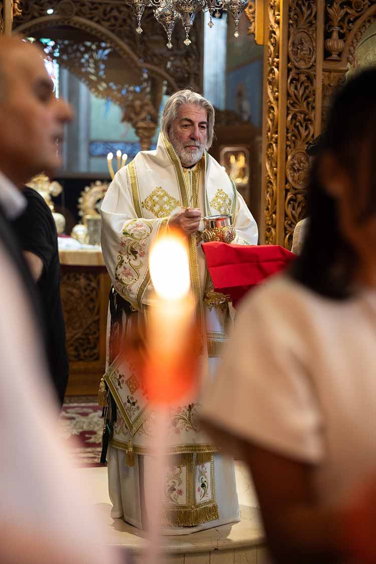 Μετά το πέρας της τελετής, οι νεοφώτιστοι, φέροντες τις αναμμένες λαμπάδες, εισήλθαν λιτανευτικώς στον κυρίως ναό, όπου και συμμετείχαν στην Πανηγυρική Θεία Λειτουργία, κοινωνούντες για πρώτη φορά των Αχράντων Μυστηρίων. Προ της απολύσεως, τον Αιδεσιμολογιώτατο Πρωτοπρεσβύτερο κ. Ιωσήφ Παλιούρα και τον Αιδεσιμώτατο Πρεσβύτερο κ. Δημητριανό Μελέκη, εφημερίους του Ναού, ευχαρίστησε θερμώς και εμφανώς συγκινημένος ο Σεβασμιώτατος Αρχιεπίσκοπος. Εξέφρασε δε τις ευχαριστίες του ομοίως προς την πλειάδα των εθελοντών, η άοκνη προετοιμασία των οποίων κατέστησε δυνατή την άρτια διεξαγωγή της πνευματικής αυτής πανδαισίας. Μετά ταύτα, εντός της αίθουσας της ενορίας, παρετέθη νηστήσιμη δεξίωση, ευγενική χορηγία του Άρχοντος κ. Λούη Λοΐζου, Προέδρου της Κοινότητος.