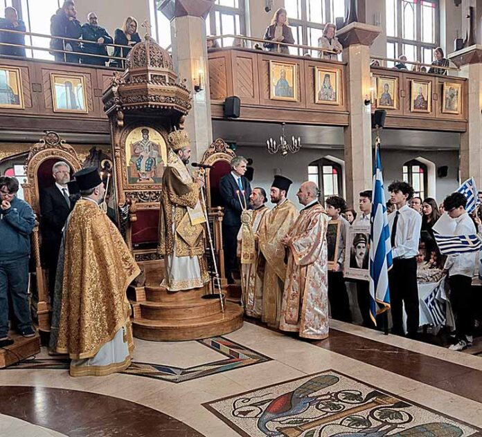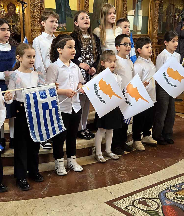 Τον συντονισμό του προγράμματος ανέλαβε η υποδιευθύντρια του ομωνύμου σχολείου κ. Μάχη Νεοφύτου, ενώ τελετάρχης του επετειακού αφιερώματος διετέλεσε ο Πρόεδρος της Κοινότητος κ. Μάριος Μηναΐδης. Κρατώντας ελληνικές και κυπριακές σημαίες, ως και φωτογραφίες των αγωνιστών της Επαναστάσεως του 1821 και της απελευθερώσεως του 1955, οι μαθητές του παροικιακού σχολείου εισήλθαν στον Ιερό Ναό, αποδίδοντας με εξαιρετικό τρόπο ποιήματα, αναγνώσματα και πατριωτικά τραγούδια.