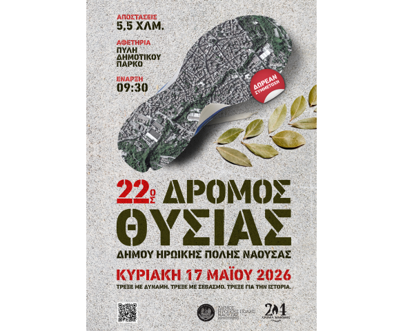 Συνεχίζονται με ιδιαίτερα αυξημένο ενδιαφέρον από τους εκατοντάδες δρομείς οι δηλώσεις συμμετοχής για τον αγώνα δρόμου «22ος Δρόμος Θυσίας» που διοργανώνει ο Δήμος Ηρωικής Πόλης Νάουσας σε συνεργασία με αθλητικούς συλλόγους την Κυριακή 17 Μαΐου 2026.
