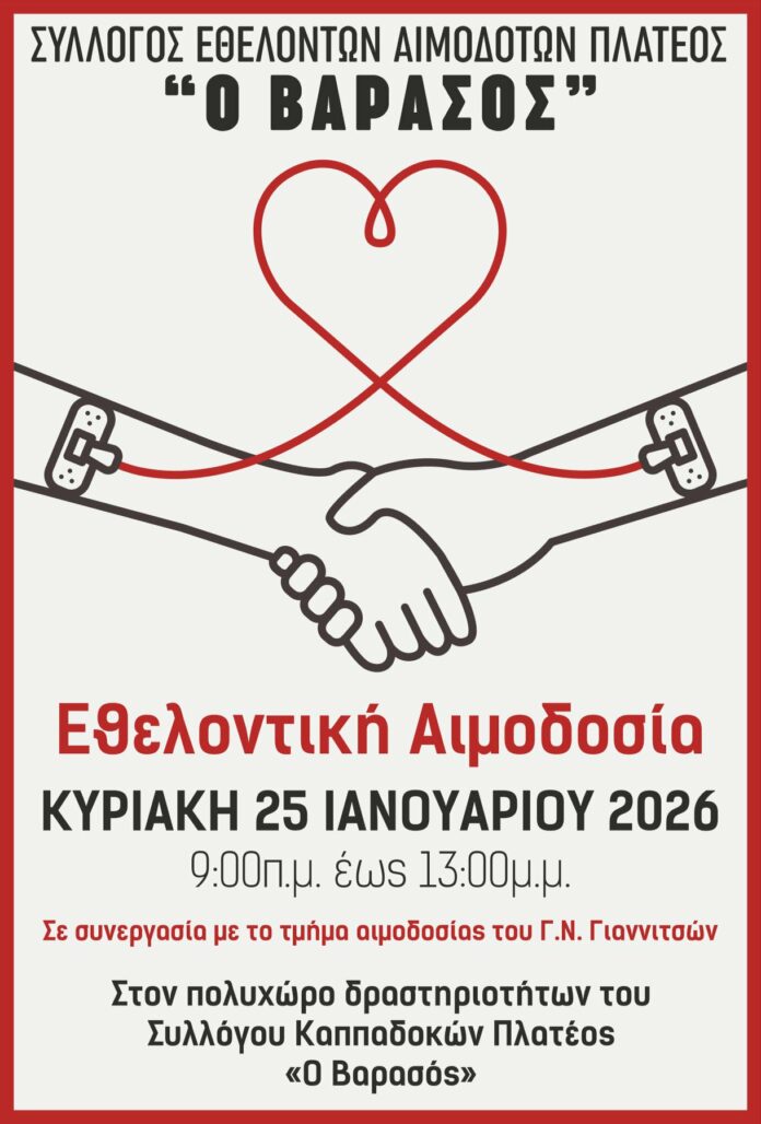Ο Σύλλογος Εθελοντών Αιμοδοτών Πλατέος Ημαθίας “Ο Βαρασός” με αίσθημα ευθύνης απέναντι στο κοινωνικό σύνολο, διοργανώνει την 16η εθελοντική αιμοδοσία του, για την διαφύλαξη της ανθρώπινης ζωής και της υγείας, που αποτελούν ύψιστο αγαθό και δικαίωμα για όλους.