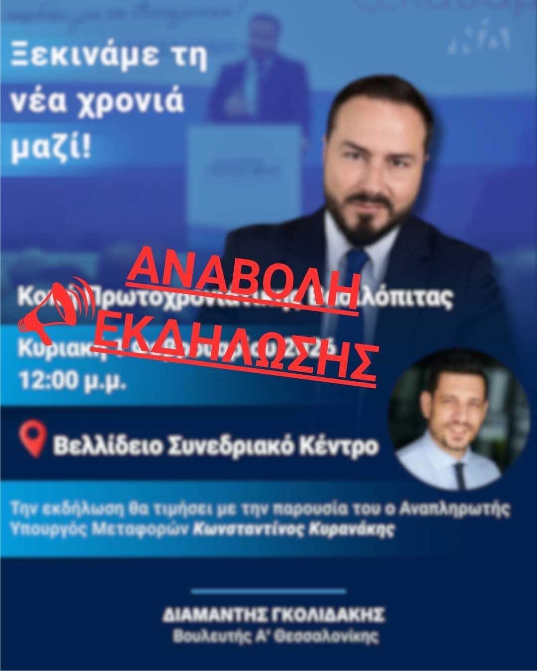 Αναβάλλεται η προγραμματισμένη για την Κυριακή, 1 Φεβρουαρίου εκδήλωση κοπής της βασιλόπιτας του πολιτικού γραφείου του Διαμαντή Γκολιδάκη. «Αυτές τις ημέρες βιώνουμε όλοι βαθιά θλίψη, τόσο για τον άδικο χαμό των νέων ανθρώπων, φιλάθλων του ΠΑΟΚ στη Ρουμανία όσο και για την τραγική απώλεια των γυναικών που εργάζονταν στην μπισκοτοβιομηχανία “Βιολάντα”.
