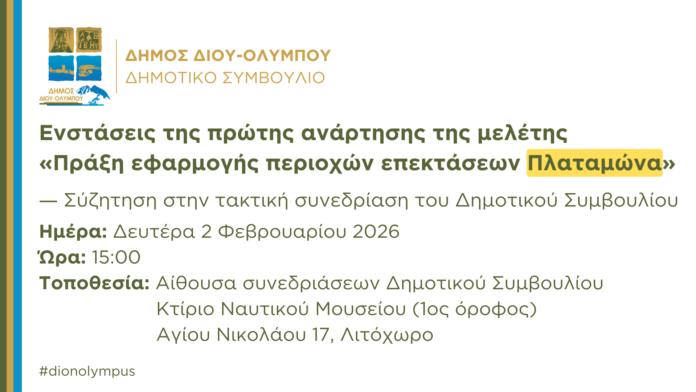 Ο Δήμος Δίου-Ολύμπου ενημερώνει ότι οι ενστάσεις επί της πρώτης ανάρτησης της μελέτης «Κτηματογράφηση – Πολεοδόμηση – Πράξη εφαρμογής περιοχών επεκτάσεων οικισμού Πλαταμώνα» θα συζητηθούν στην τακτική συνεδρίαση του Δημοτικού Συμβουλίου τη Δευτέρα 2 Φεβρουαρίου 2026 στις 3 μ.μ. στην αίθουσα συνεδριάσεων του Δημοτικού Συμβουλίου στο Λιτόχωρο (Αγίου Νικολάου 17, κτίριο Ναυτικού Μουσείου Λιτοχώρου, 1ος όροφος).