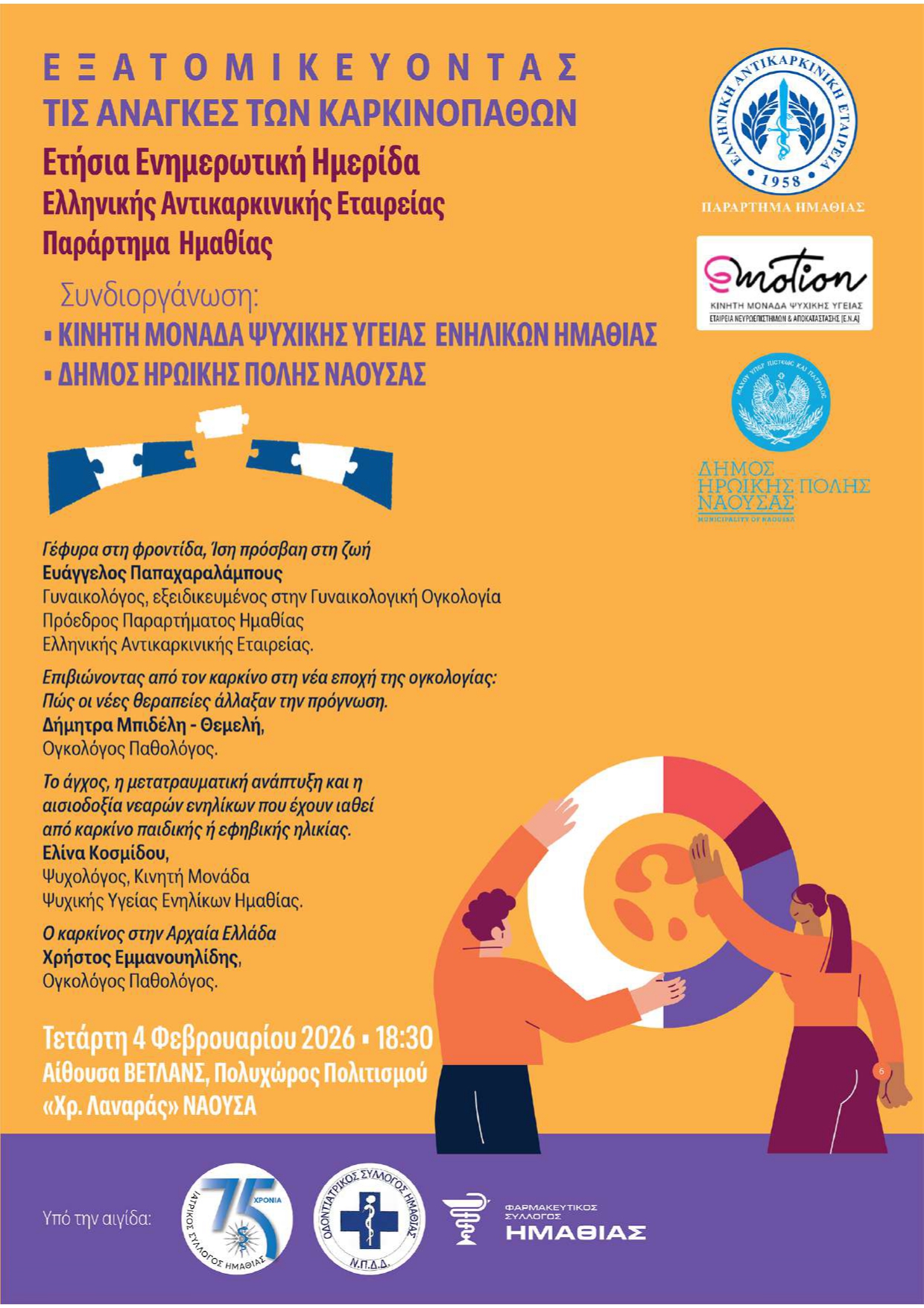 Σας προσκαλούμε στην Ετήσια Ενημερωτική  Ημερίδα, που συνδιοργανώνει η Ελληνική Αντικαρκινική Εταιρία – Παράρτημα Ημαθίας, ο Δήμος Ηρωικής Πόλης Νάουσας και η Emotion Κινητή Μονάδα Ψυχικής Υγείας Ενηλίκων Ημαθίας, που θα πραγματοποιηθεί την Τετάρτη 4/2/2026 και ώρα 18:30 στην αίθουσα ΒΕΤΛΑΝΣ, Πολυχώρος Πολιτισμού “Χρήστος Λαναράς” ΝΑΟΥΣΑ», με θέμα “Εξατομικεύοντας τις Ανάγκες των Καρκινοπαθών”