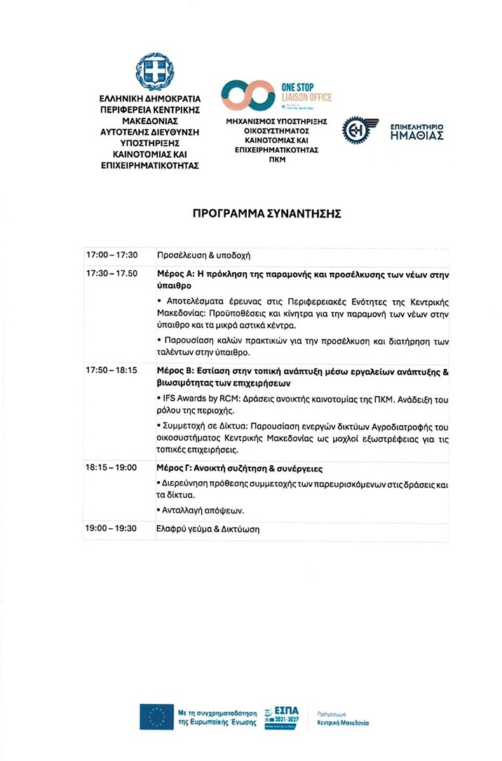 Ο Μηχανισμός Υποστήριξης Καινοτομίας και Επιχειρηματικότητας της Περιφέρειας Κεντρικής Μακεδονίας – One Stop Liaison Office (OSLO), σε συνεργασία με το Επιμελητήριο Ημαθίας, σας προσκαλούν στη Συνάντηση Εργασίας με θέμα «Σύγχρονα εργαλεία βιωσιμότητας των επιχειρήσεων: Η απάντηση στις προσδοκίες των νέων και τις προκλήσεις του τόπου μας», τη Δευτέρα 23 Μαρτίου 2026 και ώρα 17:00, στην Αίθουσα Συνεδριάσεων “ΑΠΟΣΤΟΛΟΣ ΒΕΣΥΡΟΠΟΥΛΟΣ” του Επιμελητηρίου Ημαθίας (Κεντρικής 3, Βέροια).