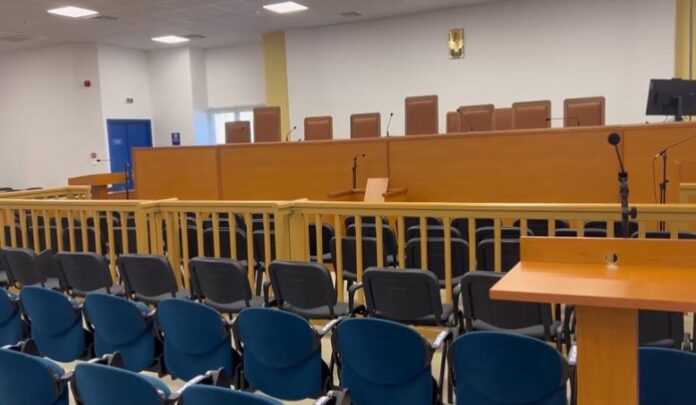 Η δικαστική αίθουσα στη Λάρισα, όπου διεξάγεται η δίκη για τα Τέμπη