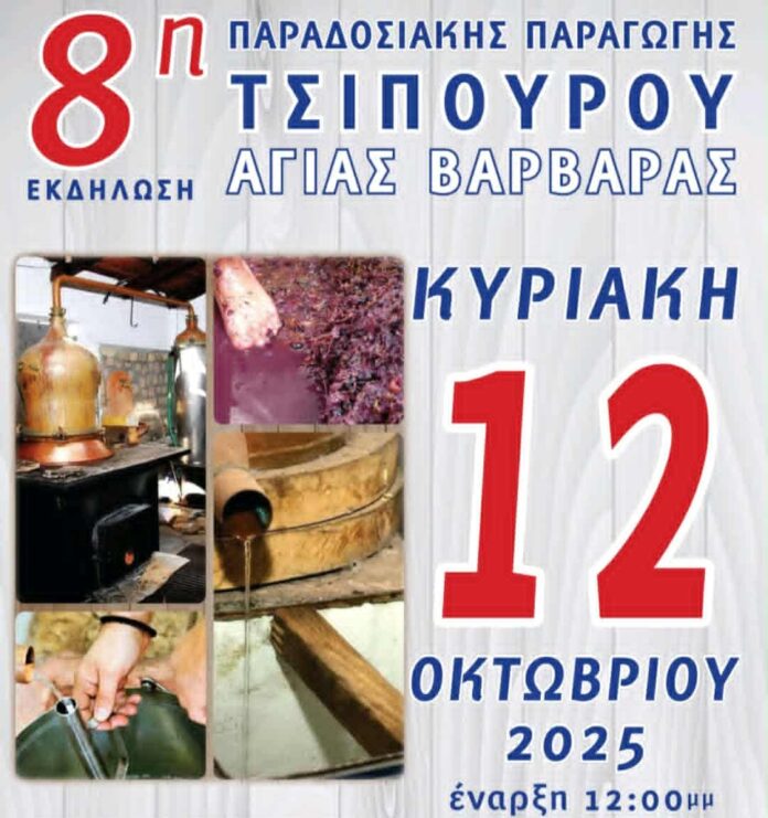 Ο πρόεδρος και τα μέλη του Δ.Σ. του Πολιτιστικός Σύλλογος Αγίας Βαρβάρας, σας προσκαλούνε, την Κυριακή 12 Οκτωβρίου 2025 στην 8η Εκδήλωση Παραδοσιακής Παραγωγής Τσίπουρου Αγίας Βαρβάρας στην πλατεία της Αγίας Βαρβάρας, στις 12:00μ.μ.
