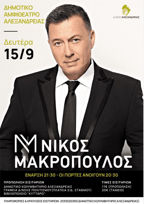 Ο Δήμος Αλεξάνδρειας ενημερώνει το κοινό ότι ξεκινά σήμερα η προπώληση εισιτηρίων για τη μεγάλη συναυλία του αγαπημένου λαϊκού τραγουδιστή Νίκου Μακρόπουλου, που θα πραγματοποιηθεί τη Δευτέρα 15 Σεπτεμβρίου 2025 και ώρα 21:30, στο Δημοτικό Αμφιθέατρο Αλεξάνδρειας.