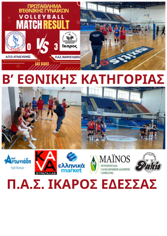 Η γυναικεία ομάδα βόλεϊ του ΠΑΣ ΙΚΑΡΟΣ ΕΔΕΣΣΑΣ ταξίδεψε στο Κιλκίς για να αντιμετωπίσει την ομάδα Α.Π.Ο ΑΤΛΑΣ ΚΙΛΚΙΣ. Η ομάδα της Έδεσσας πήρε μια σπουδαία νίκη με σκορ 0-3 σετ επί της ομάδας ΑΤΛΑ ΚΙΛΚΙΣ, σε αγώνα του πρωταθλήματος της Β’ Εθνικής Γυναικών.