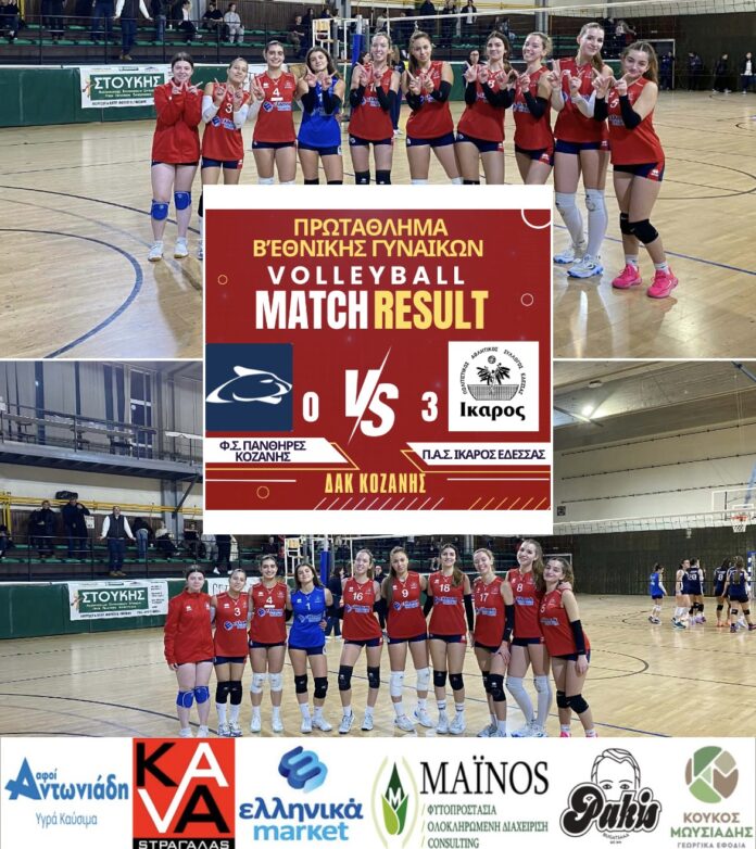 Η ομάδα βόλεϊ ΠΑΣ ΙΚΑΡΟΣ ΕΔΕΣΣΑΣ πέτυχε μια σημαντική εκτός έδρας νίκη 0-3 επί του Φ.Σ. ΠΑΝΘΗΡΕΣ ΚΟΖΑΝΗΣ, στα πλαίσια του πρωταθλήματος Β’ Εθνικής Κατηγορίας Γυναικών.